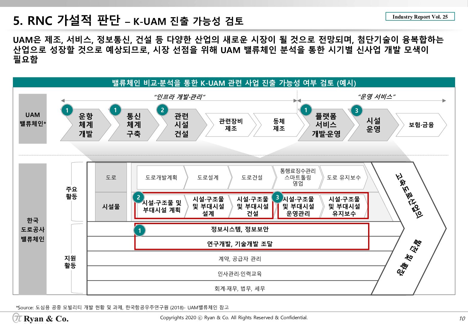 UAM은 제조, 서비스, 정보통신, 건설 등 다양한 산업의 새로운 시장이 될 것으로 전망되며, 첨단기술이 융복합하는 산업으로 성장할 것으로 예상되므로, 시장 선점을 위해 UAM 밸류체인 분석을 통한 시기별 신사업 개발 모색이 필요함