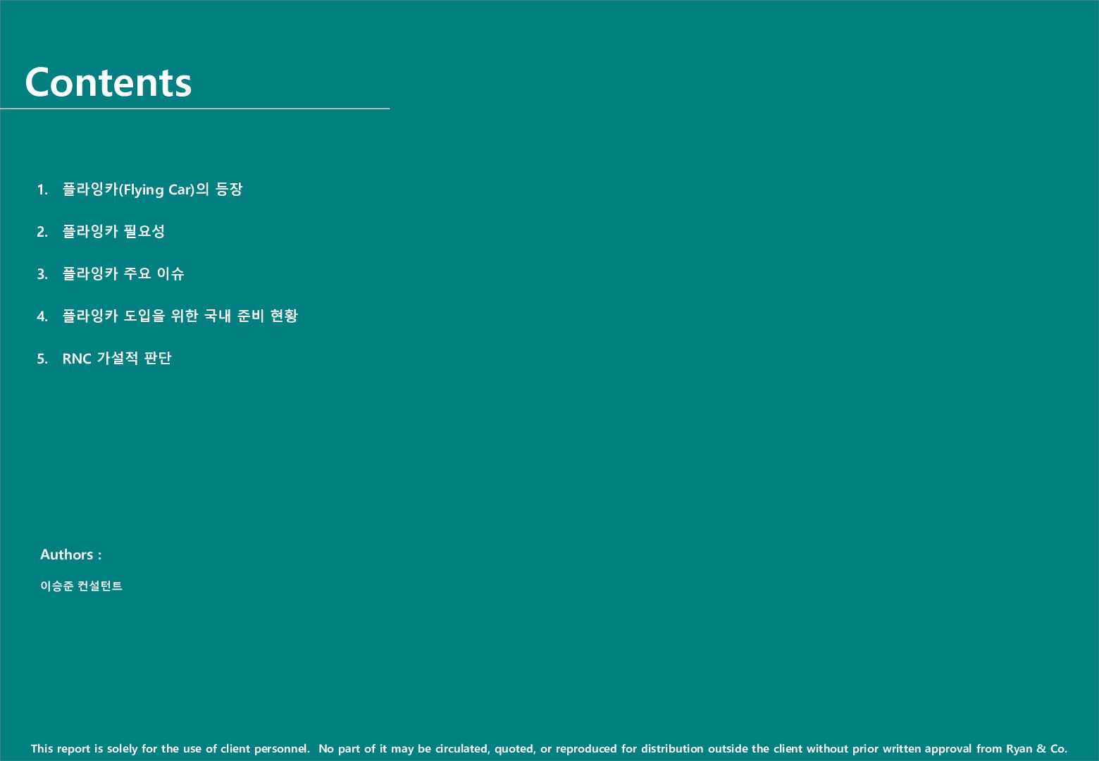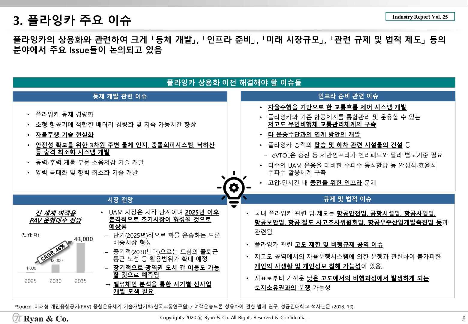 플라잉카의 상용화와 관련하여 크게 「동체 개발」, 「인프라 준비」, 「미래 시장규모」, 「관련 규제 및 법적 제도」 등의 분야에서 주요 Issue들이 논의되고 있음