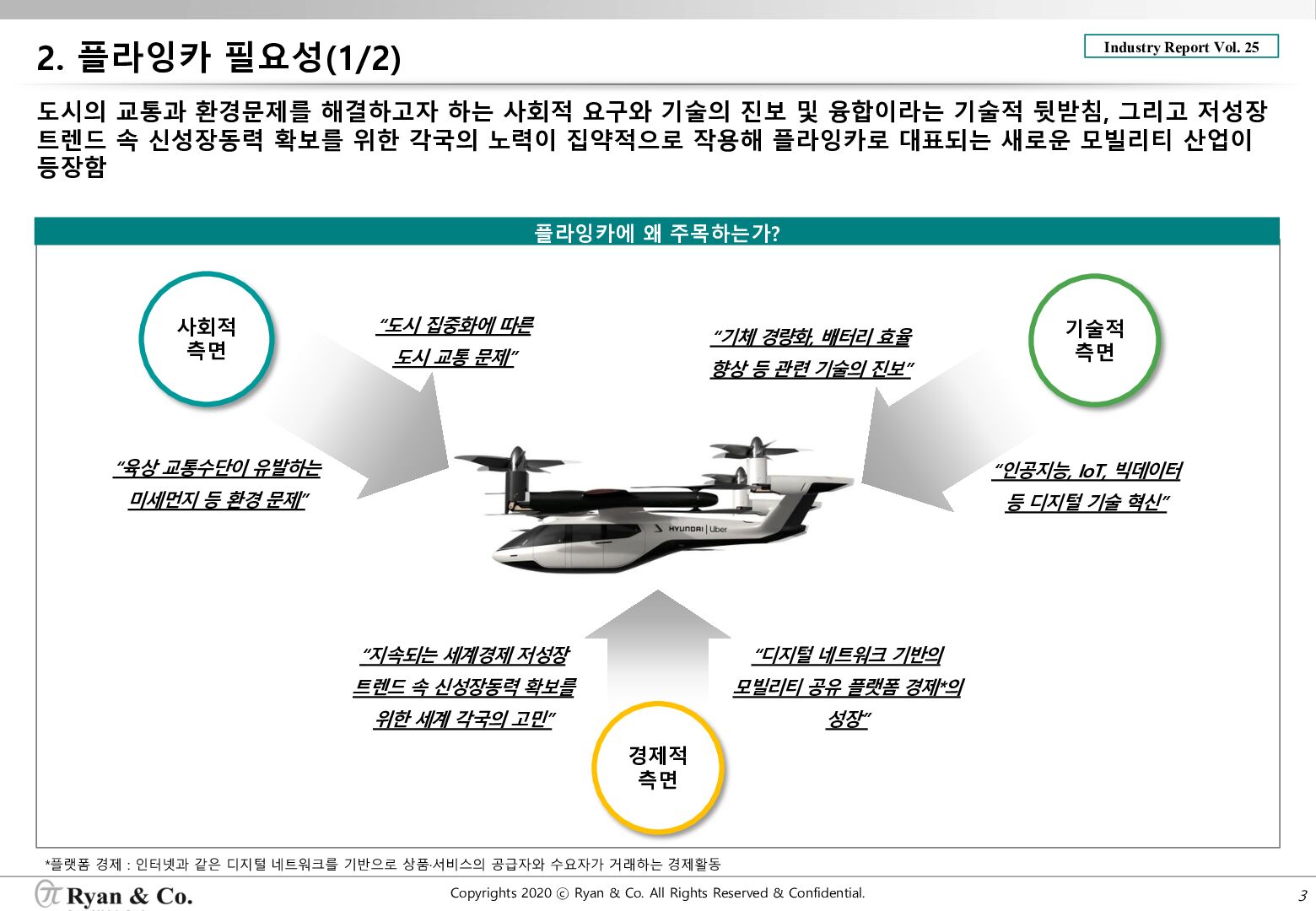 도시의 교통과 환경문제를 해결하고자 하는 사회적 요구와 기술의 진보 및 융합이라는 기술적 뒷받침, 그리고 저성장 트렌드 속 신성장동력 확보를 위한 각국의 노력이 집약적으로 작용해 플라잉카로 대표되는 새로운 모빌리티 산업이 등장함
