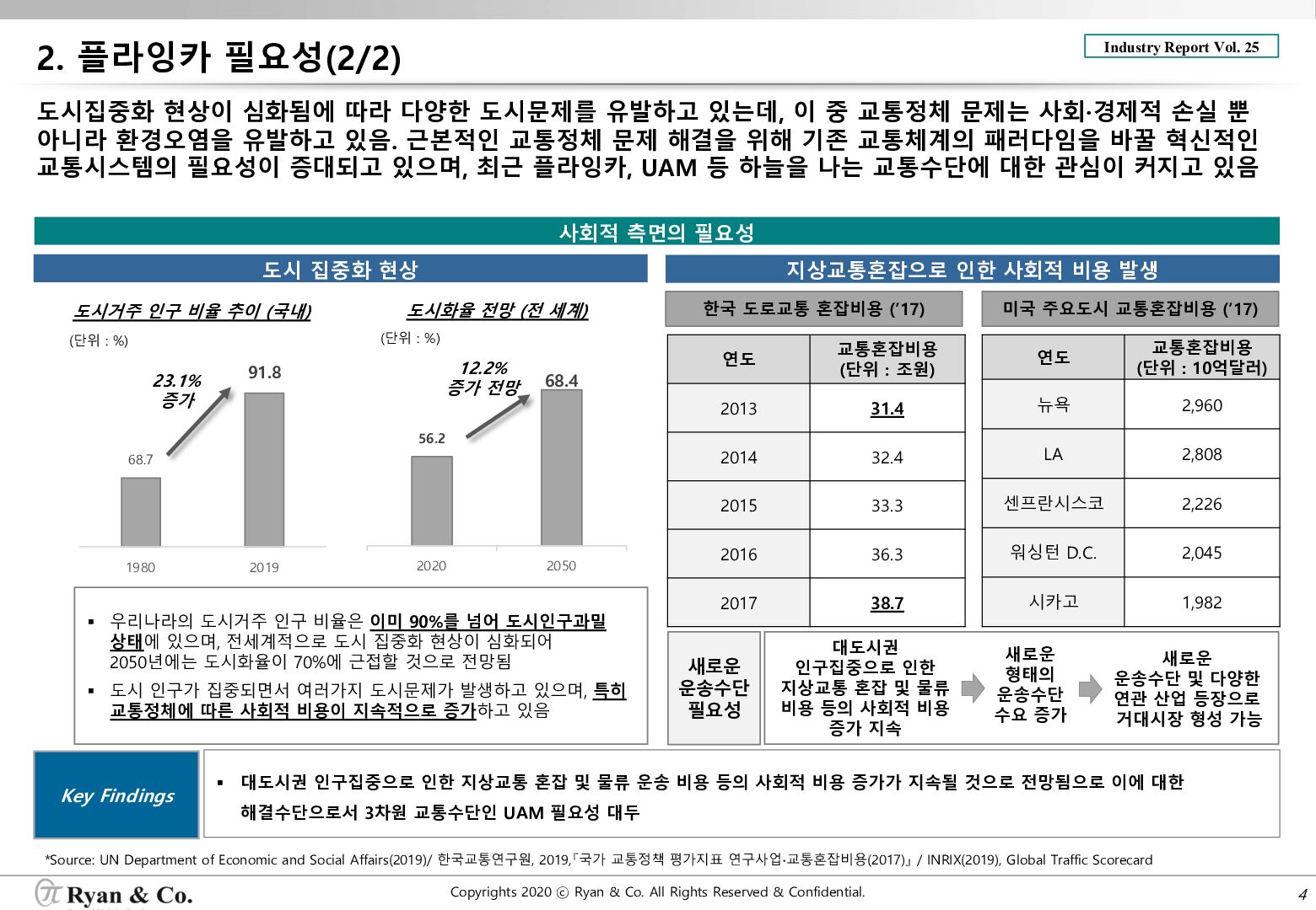도시집중화 현상이 심화됨에 따라 다양한 도시문제를 유발하고 있는데, 이 중 교통정체 문제는 사회·경제적 손실 뿐 아니라 환경오염을 유발하고 있음. 근본적인 교통정체 문제 해결을 위해 기존 교통체계의 패러다임을 바꿀 혁신적인 교통시스템의 필요성이 증대되고 있으며, 최근 플라잉카, UAM 등 하늘을 나는 교통수단에 대한 관심이 커지고 있음