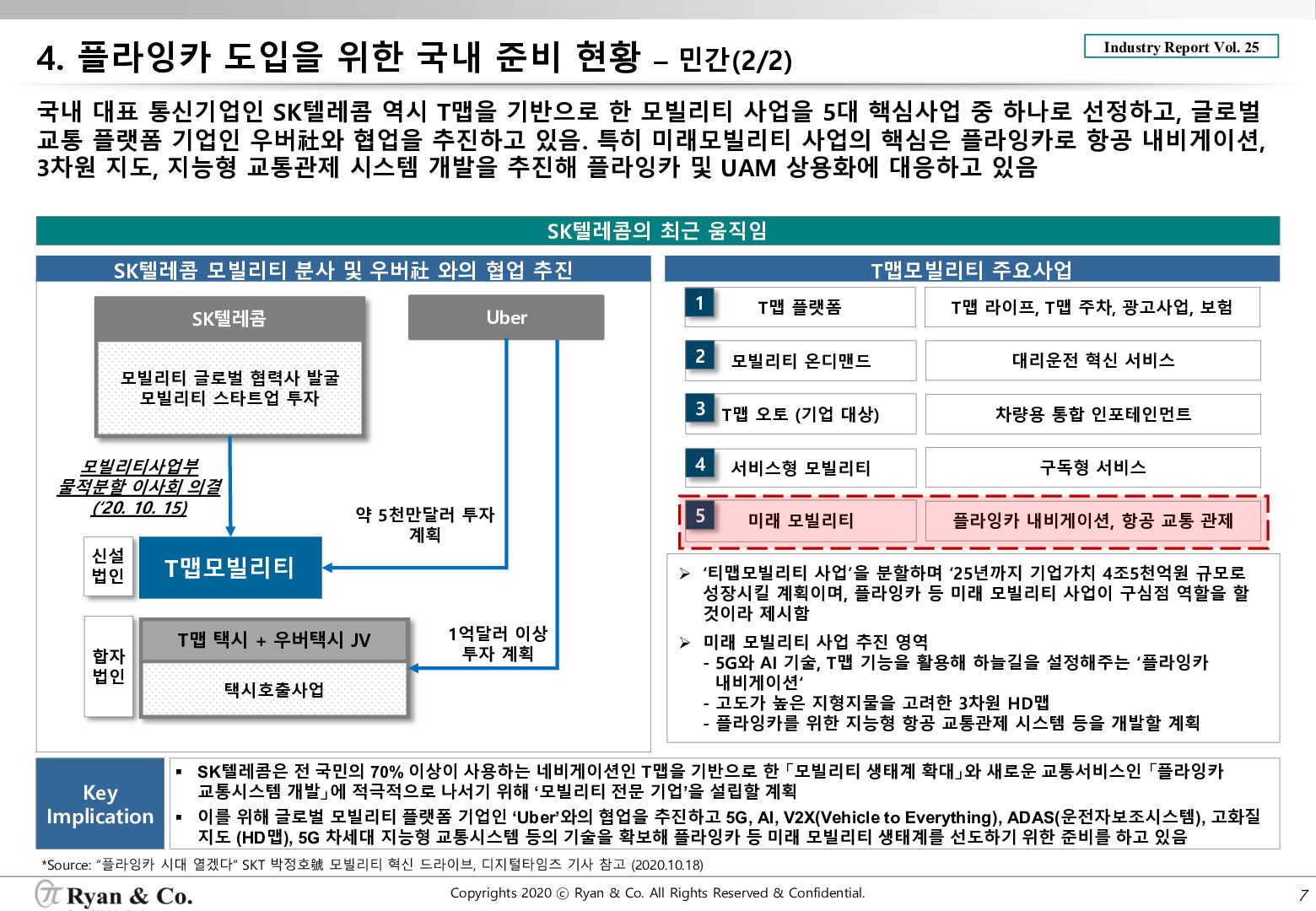 국내 대표 통신기업인 SK텔레콤 역시 T맵을 기반으로 한 모빌리티 사업을 5대 핵심사업 중 하나로 선정하고, 글로벌 교통 플랫폼 기업인 우버社와 협업을 추진하고 있음. 특히 미래모빌리티 사업의 핵심은 플라잉카로 항공 내비게이션, 3차원 지도, 지능형 교통관제 시스템 개발을 추진해 플라잉카 및 UAM 상용화에 대응하고 있음